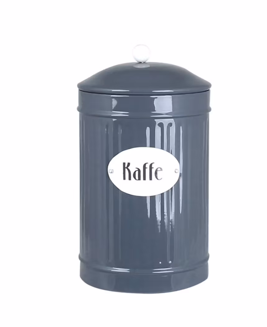 Rund plåtburk med lock med texten Kaffe. Från plåtburksserien Hugo Blå.