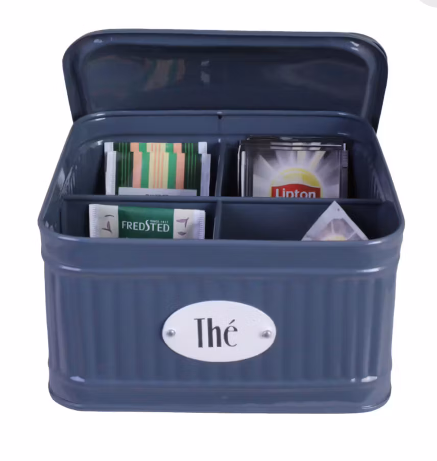 Plåtburk Hugo Thé är en stilren och praktisk plåtburk i vacker blå färg, utrustad med smarta fack för enkel organisering av olika sorters Thé. Perfekt för förvaring med charm och funktionalitet.