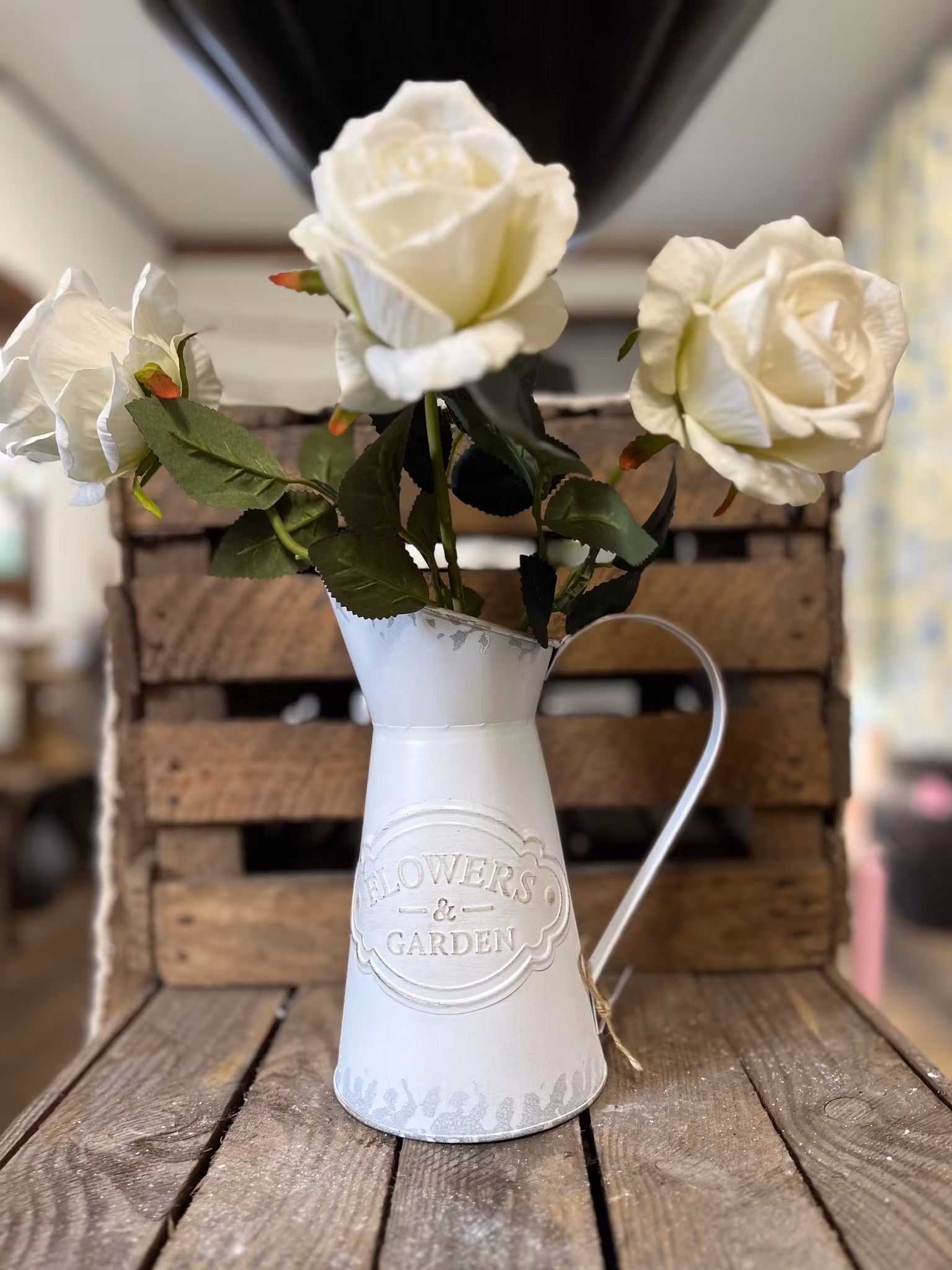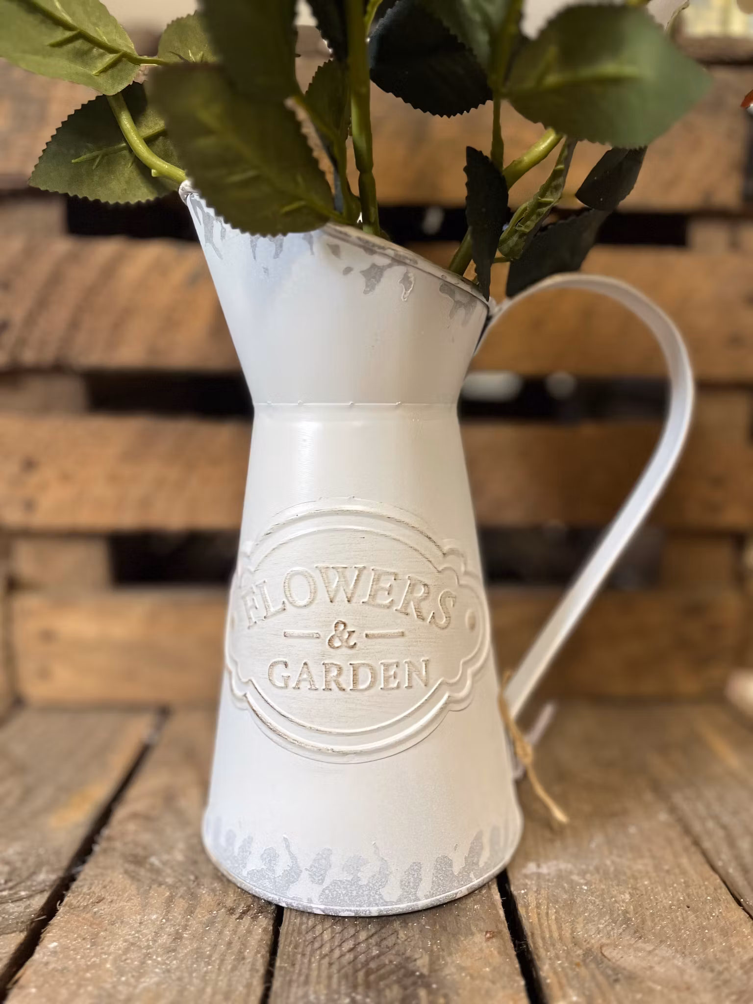 Vit gammaldags kanna i plåt som passar både för dryck eller blommor.23 cm högSka ej diskas i diskmaskinen