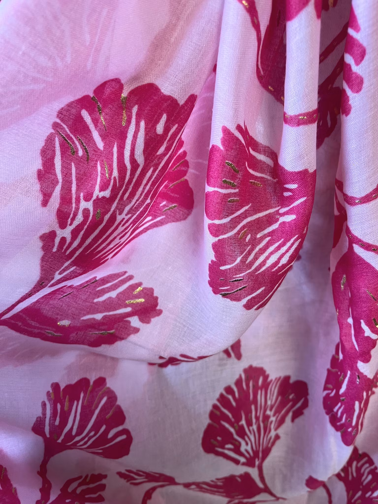 Vilken färg klick, en rosa sjal med cerises blad och guld stänk.