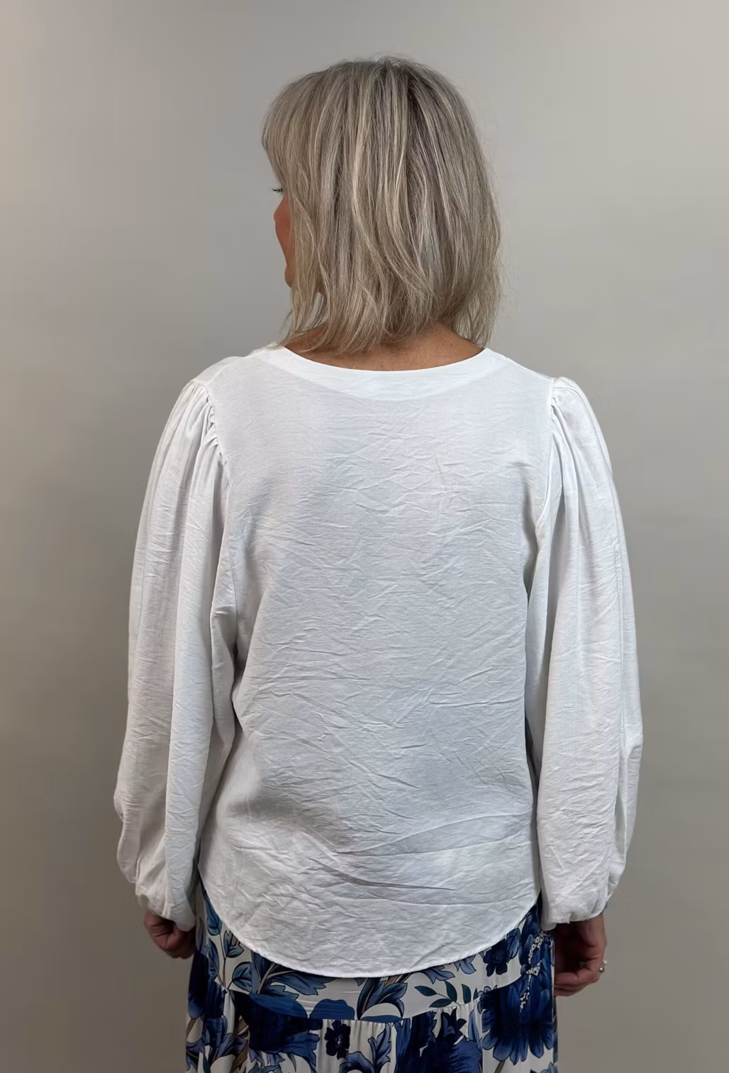 Denna fina och sköna blus med så fin V-hals och lång puffärm med smal resår.
