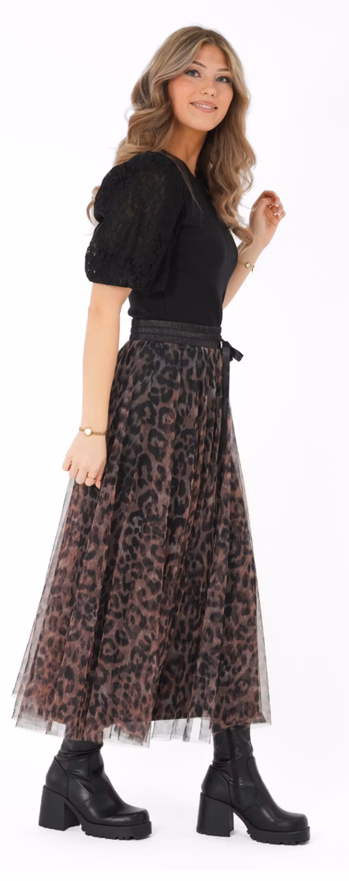 Natalia Tyllkjol, vinterns coolaste kjol har anlänt! En otroligt fin tyllkjol med ett mjukt trikåfoder. Kjolen ger en snygg volym och har en strechig linning i satin. Utöver resår i midjan finns även ett fint satinband som går att justera för den perfekta passformen. Kjolen har ett trendigt leopardmönster i bruna och svarta toner.