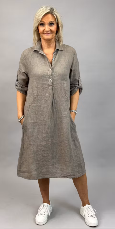 Linne klänning med fickorMaterial: 100% linneFärg: TaupeStorlek: OnesizeCA Mått: Armhåla till armhåla: 54 cm, Bak Nacke & ner: 103 cm
