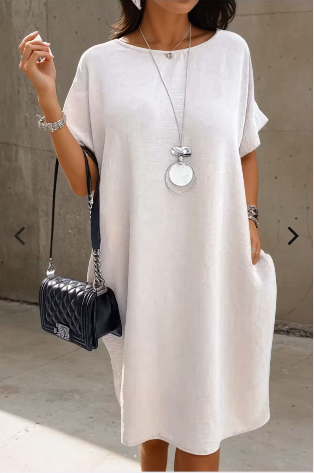 En klänning med praktiska fickor och korta ärmar. Den är 100 cm lång och har ett bystmått på 120 cm, vilket ger en bekväm passform. Perfekt för varma dagar, där både stil och funktionalitet kombineras för en enkel men elegant look.