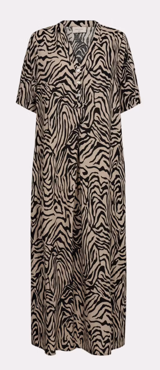 Klänning i lätt och mjukt material med leopard mönster. Klänningen har en enkel siluett med v-hals, knappar, kort ärm . Löstsittande skjortklänning, veck framtill.