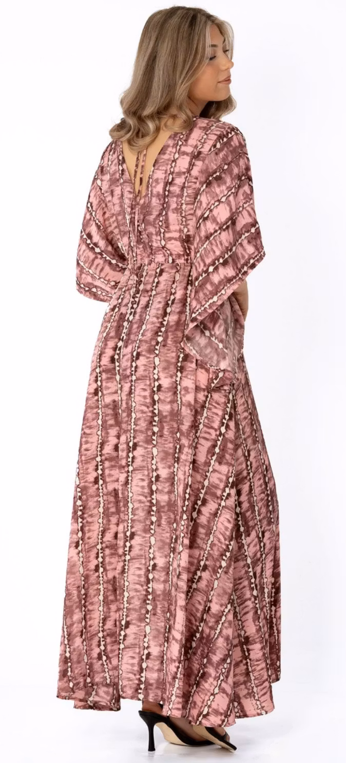 Batikmönstrad i mjuka rosa toner i ett vackert och silkigt tyg. V-ringad både fram och bak, vida ärmar och slits framtill. Band i nacken som knyts som en fin detalj. Klänningen har en mjuk resår i midjan bak, samt en dragsko fram med två band med vackra tofsar