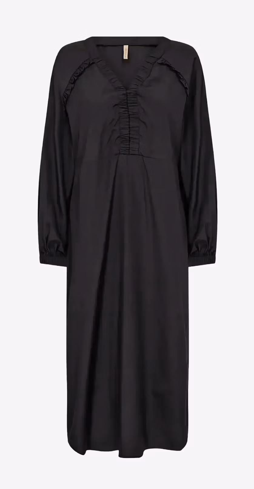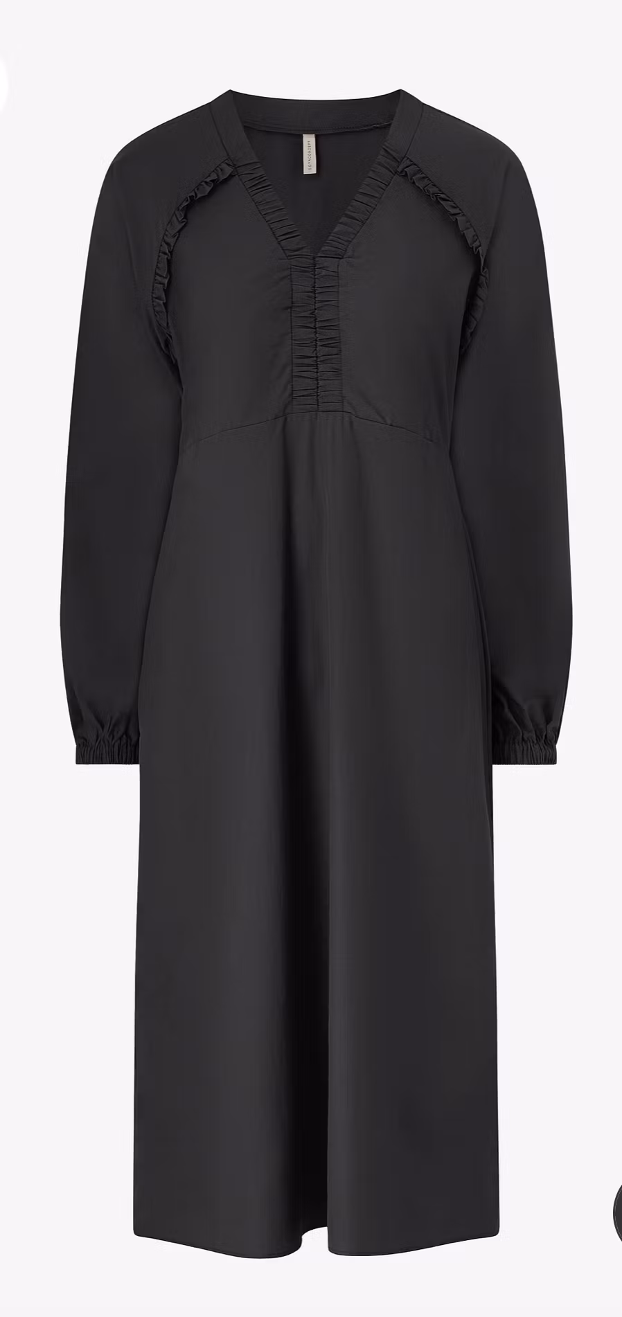 Denna klänning är tillverkad av en blandning av återvunnen polyester och ekologisk bomull, och har långa ärmar och en smickrande V-ringning med fina plisseringar. Den avslappnade passformen och längden under knäet gör den till ett mångsidigt val. Styla den med ankelstövlar och ett statement-halsband.