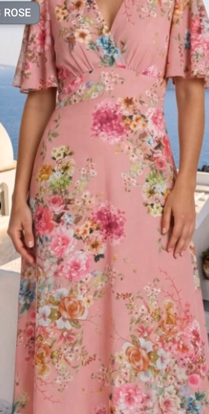 En riktig sommarklänning i rose med blommor. v-ringad och med smock i ryggen och lite ärm. 100% viskos så den är ljuvlig att ha på sig.