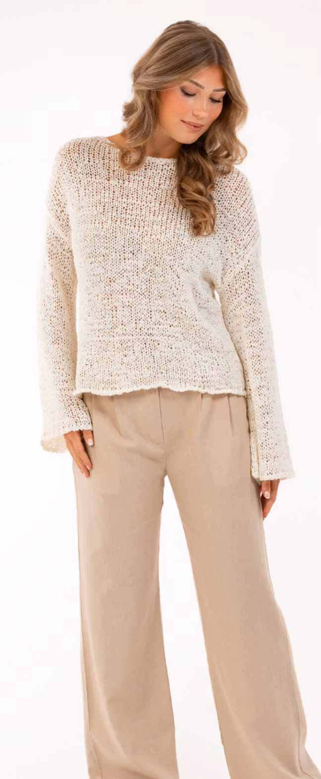 Härlig stickad tröja gjord i populära garnet Tape yarn – ett platt garn som ger en fin effekt. Tröjan är ledig i passformen och tänka att sitta löst på kroppen. Nedsänkta axlar och rundad hals. Tillsammans med de utställda ärmarna i fullängd så har du den kompletta vårtröjan!