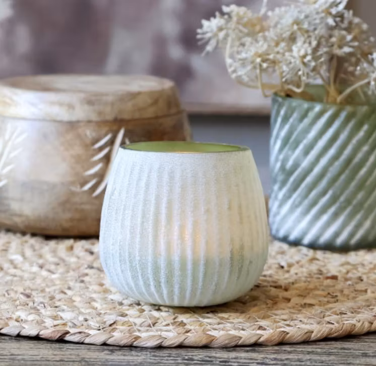 öt ljushållare i frostat glas .Ljushållaren har en ojämn yta med ränder som för tankarna till sommar och sandiga stränder.Kombinera flera ljuslyktor i olika for