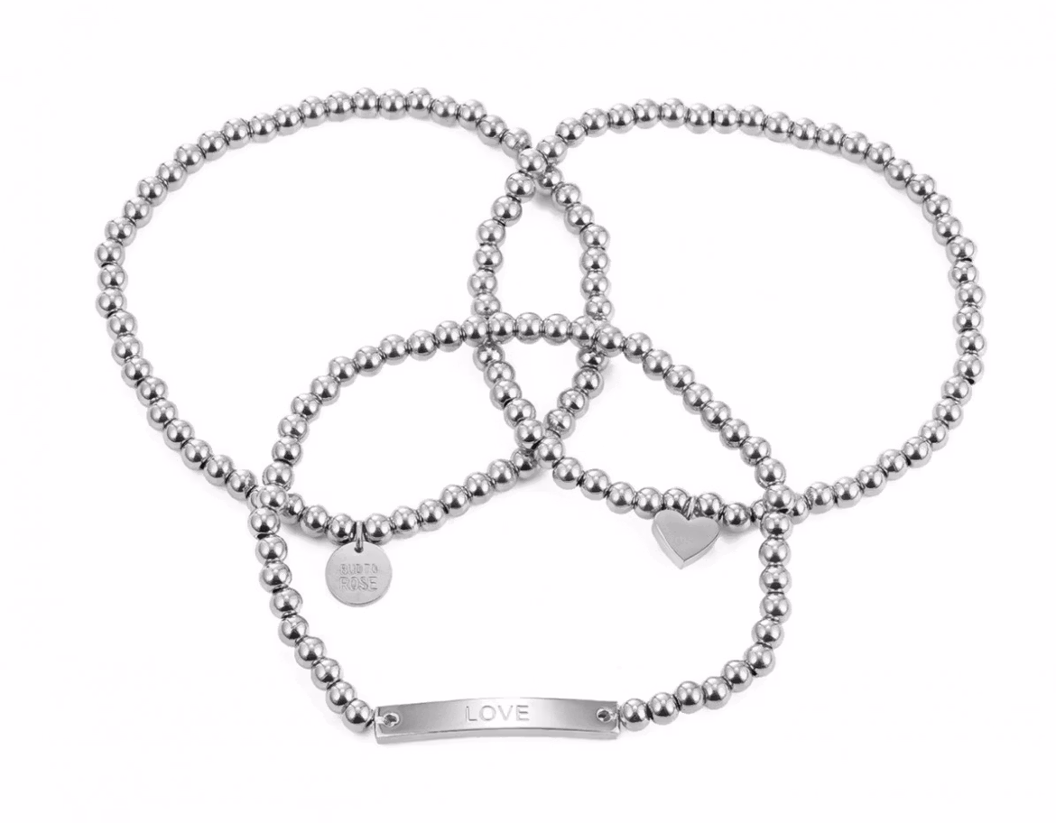 Annika Bracelet i silver- tre armband i ett som du kan bära ihop eller var för sig.Storlek: ElastisktStorlek på kulor:4mmText på platta: LOVEMaterial: Rostfritt